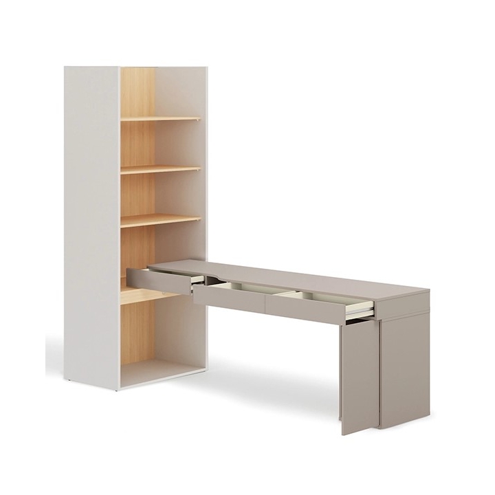 The SET-WOS9PVB set from the WOOW collection is a thoughtful solution for a youthful space where every square metre is at a premium. The composition comprising a pedestal, right-hand desk and a wide bookcase is 273 cm wide, 216 cm high and 85 cm deep, which makes it suitable for small interiors without sacrificing the comfort of everyday use. The whole set is maintained in a modern colour combination of champagne, oak vincenza bleached and clay grey, which give the space a distinctive yet subtle character.