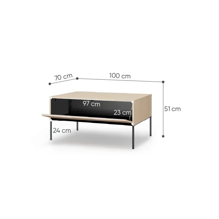 The table measures 100 cm in width, 51 cm in height, and 70 cm in depth, with a total weight of 29.5 kg. These proportions allow for comfortable use within a living area. The furniture type is defined as a coffee table, clearly indicating its purpose.