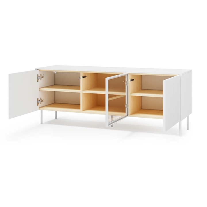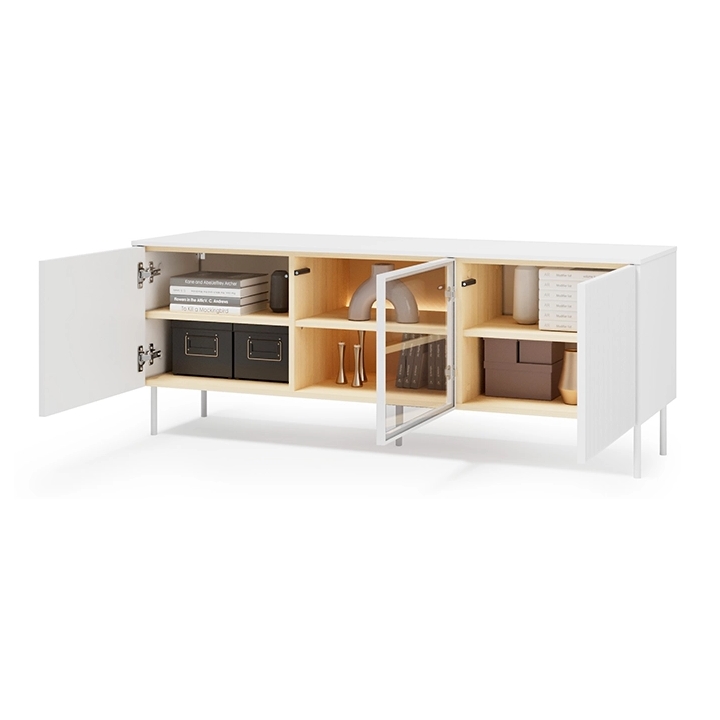 The Liba LB-06A TV cabinet, measuring 147 cm in width, 57 cm in height, and 41 cm in depth, is designed with a minimalist form and bright colour palette. The white, subtly fluted fronts are paired with a warm Vincenza oak finish inside, creating a balanced combination of modern simplicity and natural accents. The absence of traditional handles, replaced by a push-to-open system, enhances the clean design while ensuring convenient everyday use.