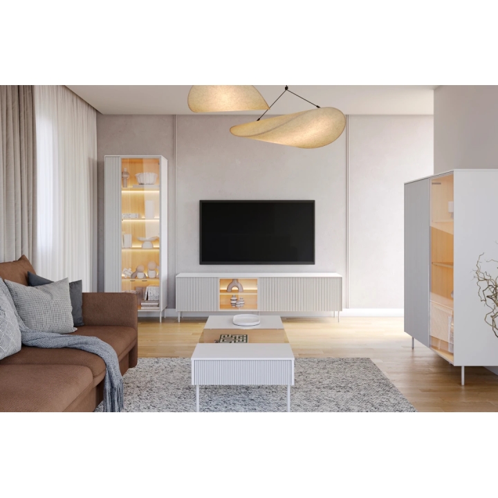 At the centre of the cabinet is a tempered glass door, allowing you to display decorative items or multimedia equipment. Inside, integrated LED lighting with adjustable intensity highlights the contents and adds a soft, ambient atmosphere to the living space.