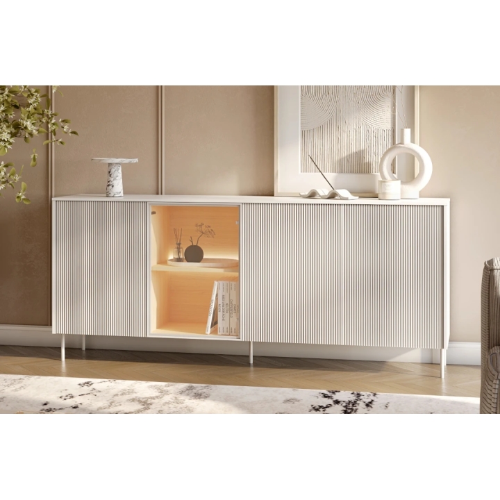 The Liba LB-04 sideboard is a four-door unit designed for modern living spaces. Its white fluted fronts combined with a warm Vincenza oak interior create a balanced and cosy look that fits various interiors.