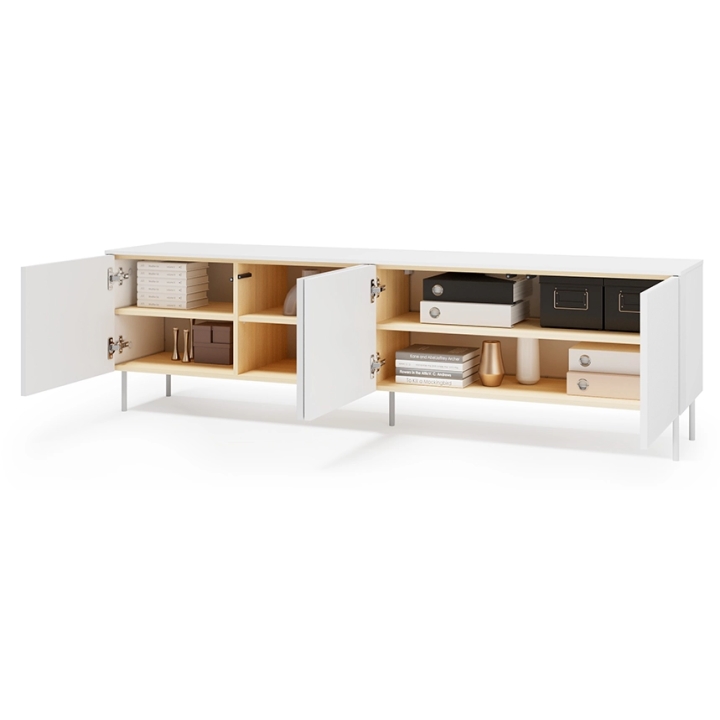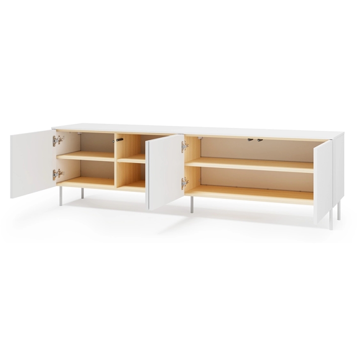 The Liba LB-05A TV cabinet, measuring 195 cm in width, 57 cm in height, and 41 cm in depth, is a spacious piece designed for larger living areas. Its white fluted fronts combined with a warm Vincenza oak interior create a balanced and modern look that fits a variety of interiors.
