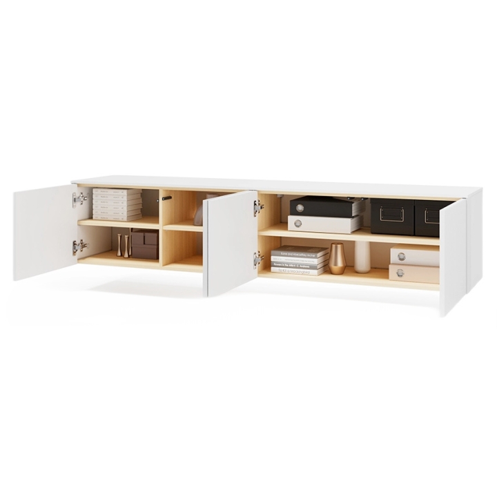 The Liba LB-05B TV cabinet, measuring 195 cm in width, 42 cm in height, and 41 cm in depth, is a wall-mounted unit designed for modern living rooms. Its white fluted fronts combined with a Vincenza oak interior create a clean and balanced look.