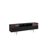 The RTV cabinet by Lissy from the ARTE collection will become the centrepiece of your living room. The furniture was designed with modern interiors in mind. The furniture body is made of furniture board in black with a semi-matt finish, resistant to scratches and damage. The fronts of the furniture were made of MDF in ebony gloss. The cabinet is fitted with two lockable shelves ideal for storing family albums or a record collection. In the central part of the furniture we will find an open shelf, which will allow us to display any electronic equipment. The cabinet additionally has two drawers providing space for favourite magazines or the ever-lost TV remote control. The structure has been placed on high metal legs for easy access to the furniture during household cleaning.
