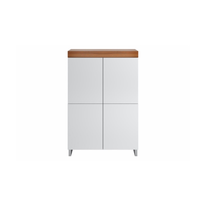 The presented product has fronts and body in white gloss, the upper rim is made in noble American walnut veneer. The height is 150 cm, the width is 100 cm and the depth is 43 cm.