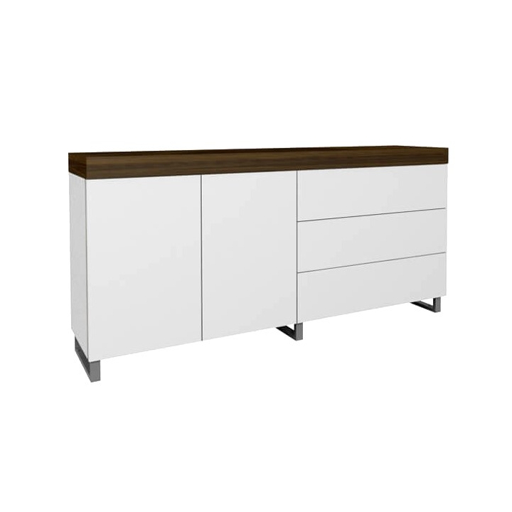 The presented product was made of natural oak veneer and white acrylic in high gloss. The furniture is based on ground stainless steel legs. The height is 95 cm, the width is 200 cm and the depth is 43 cm.