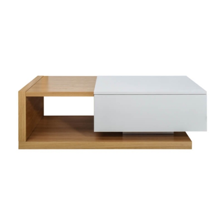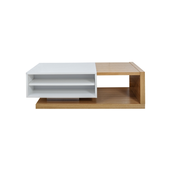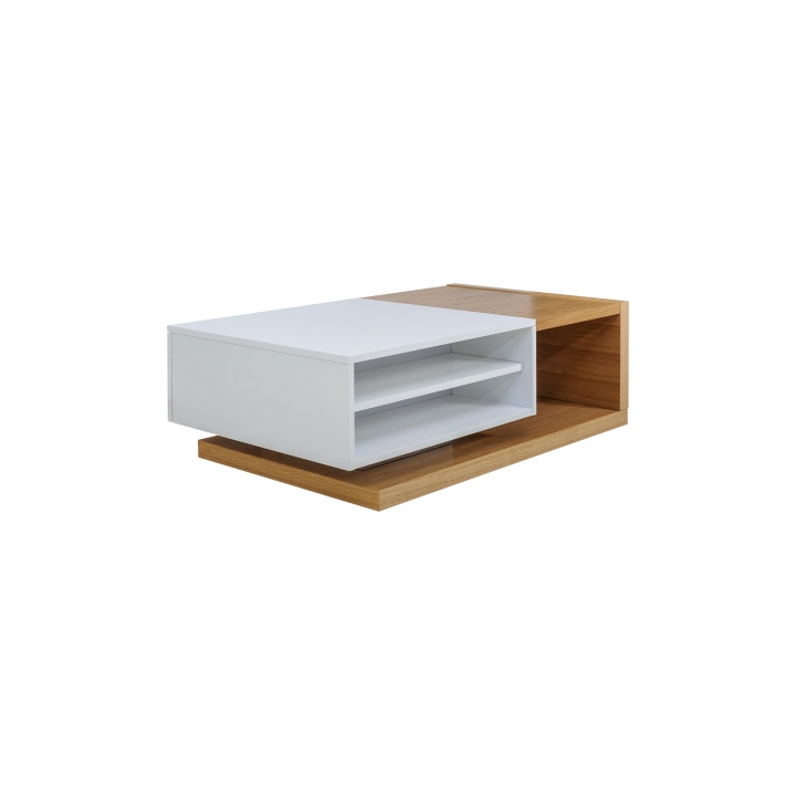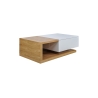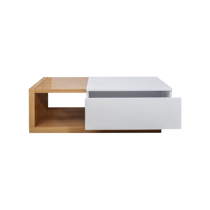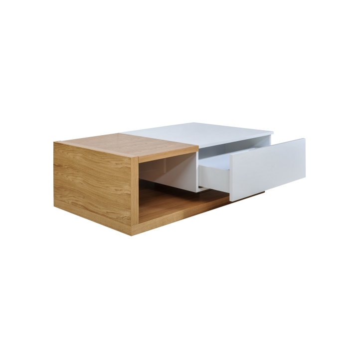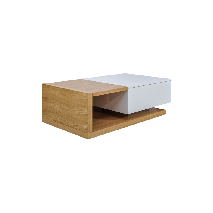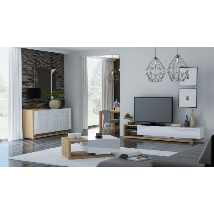 The presented product has a natural oak veneer on the top and a board in white high gloss. The height is 40 cm, the width is 125 cm and the depth is 70 cm.