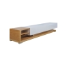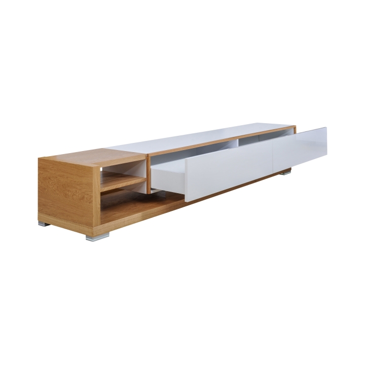 The presented product has drawers in white with glossy fronts, while the tops are in natural oak veneer lacquered in semi-matt. The height is 40 cm, the width is 200 cm and the depth is 46 cm.
