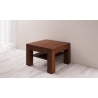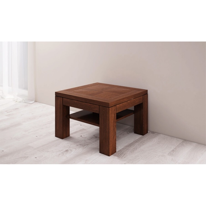 The presented product is made of wood and natural oak veneer. The legs are covered in solid oak. The height is 46 cm, the width is 70 cm and the depth is 70 cm.