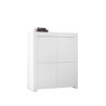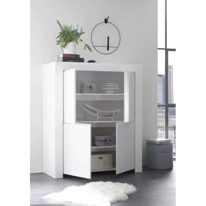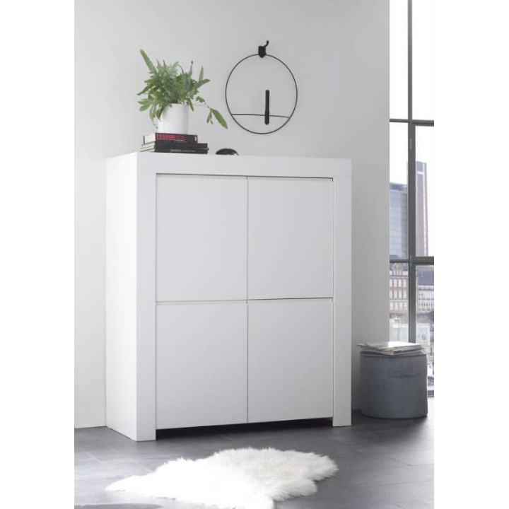The presented product was made in a universal matt white colour. It has four doors and drawers with milled handles ensuring comfortable use and emphasising the unconventional, avant-garde character of the room. The height is 140 cm, the width is 110 cm and the depth is 42 cm.