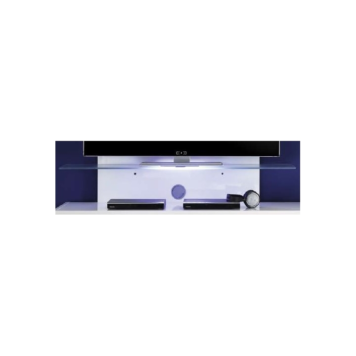 The presented product is made of MDF in white gloss combined with matt. It has a glass shelf. The height is 51 cm, the width is 200 cm and the depth is 51 cm.