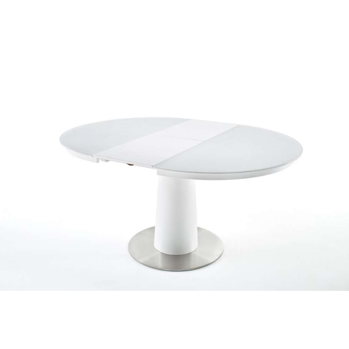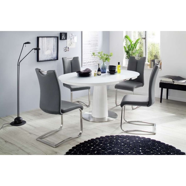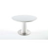 The table is made of MDF in matt white. The base is finished in brushed stainless steel. The height is 76 cm, the width is 120 (160) cm and the depth is 120 cm.