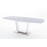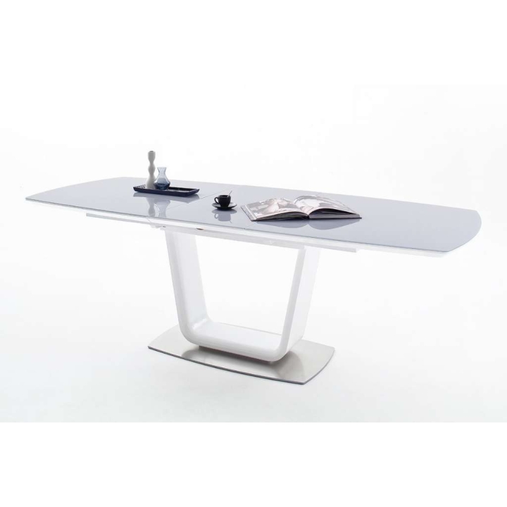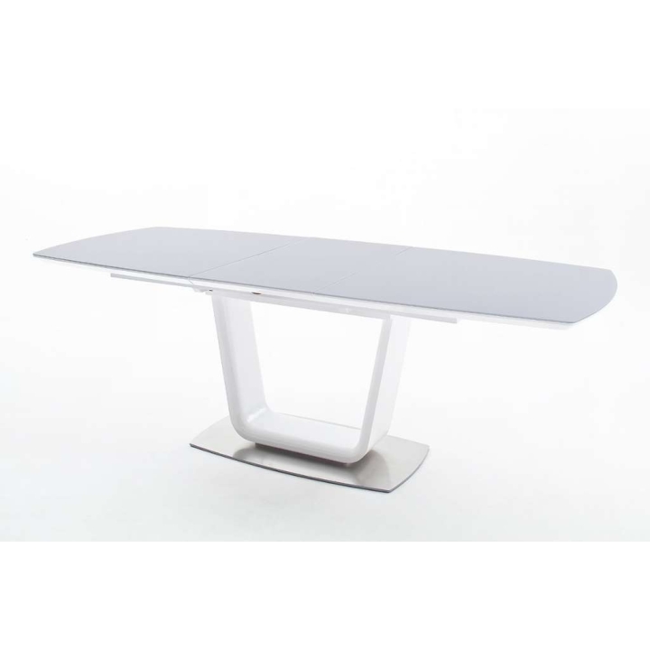 The presented product is made of MDF board in white gloss. The base is finished in brushed steel. The height is 76 cm, the width is 180 (230) cm and the depth is 95 cm.