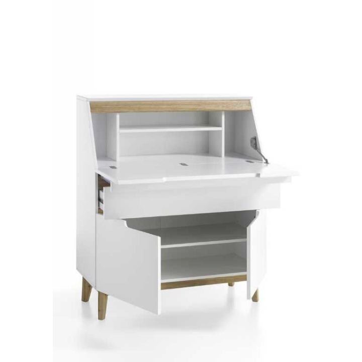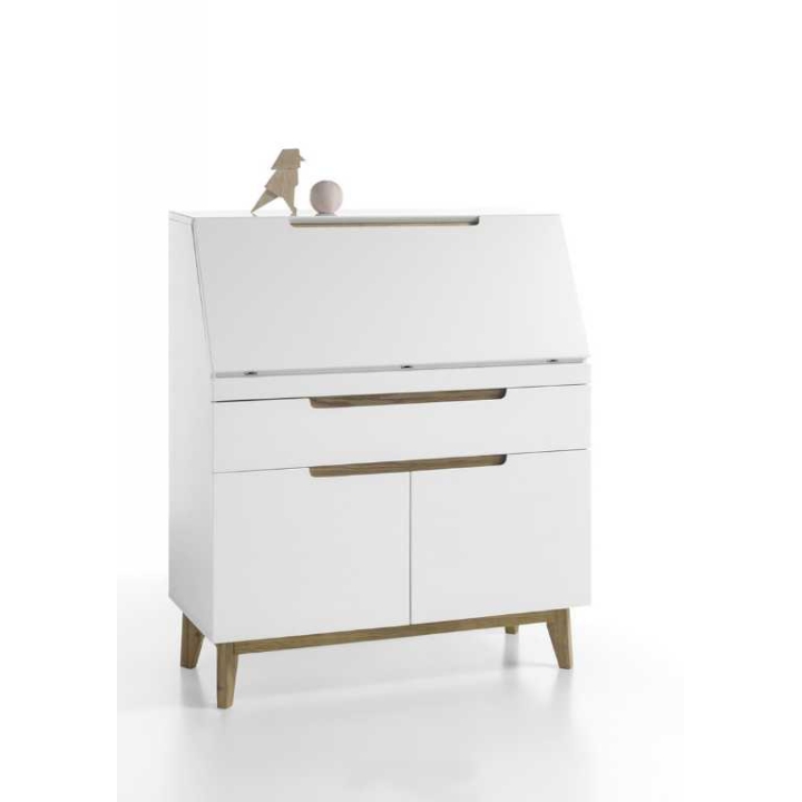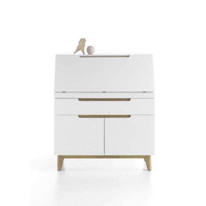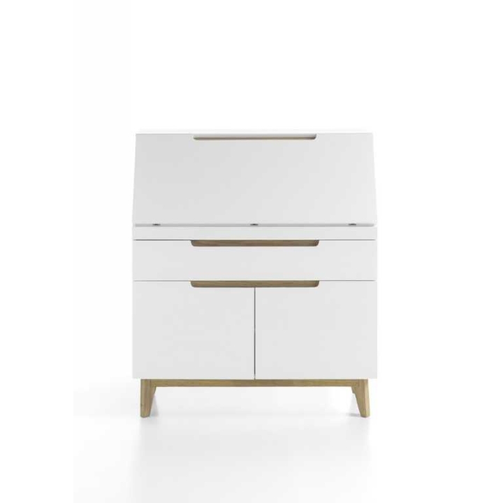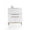 This product is made of MDF lacquered in matt white. It has shapely wooden legs in the colour of oak. The height is 113 cm, the width is 97 cm and the depth is 40 cm.