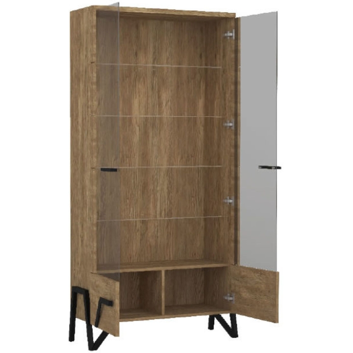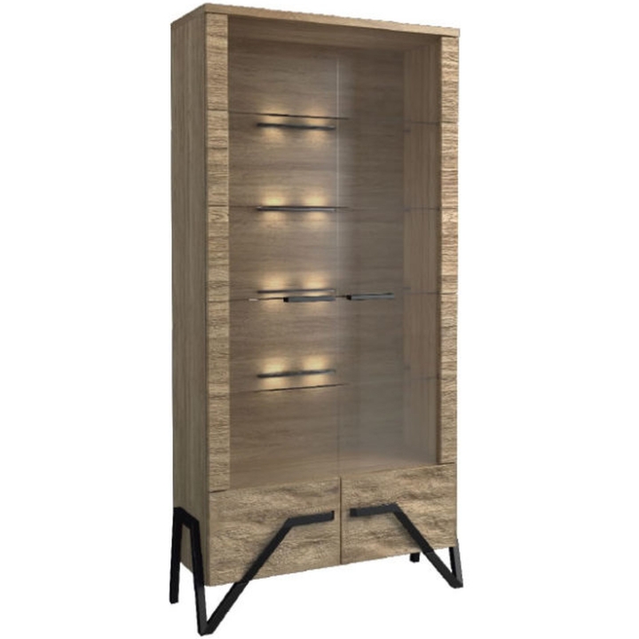 The Pik cabinet from the Mebin collection is a modern piece of furniture characterised by a stylish appearance as well as great functionality. The display cabinet is a beautiful combination of elegant black and natural wood. The simple geometry will make it fit perfectly into any room. The natural oak shade will be the solution for those wishing to brighten up the room a little. The unit is set on high, solid legs, which not only makes it easier to keep the room clean, but also makes the interior look larger. The capacious interior of the display case, equipped with glass shelves, will provide space where you can easily place a collection of glasses or porcelain. The contents of the display cabinet will be highlighted in an impressive way by the LED lighting.