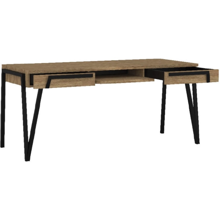 The designer desk from the PIK collection by Mebin is a unique design accessory that will bring a touch of industrial style to your interior. It will be perfect for both modern and loft-style interiors. The desk has a spacious top, which will provide space for effective work and study. The furniture is also equipped with a practical shelf, which will provide space for small accessories or documents. The furniture top is made of high quality board and solid wood elements. The furniture is available in two variants. Natural oak will be the solution for those wishing to brighten up the room a little, while chestnut is for customers who prefer a more classic colour scheme. The body is set on high metal legs that add a distinctive touch to the overall design.