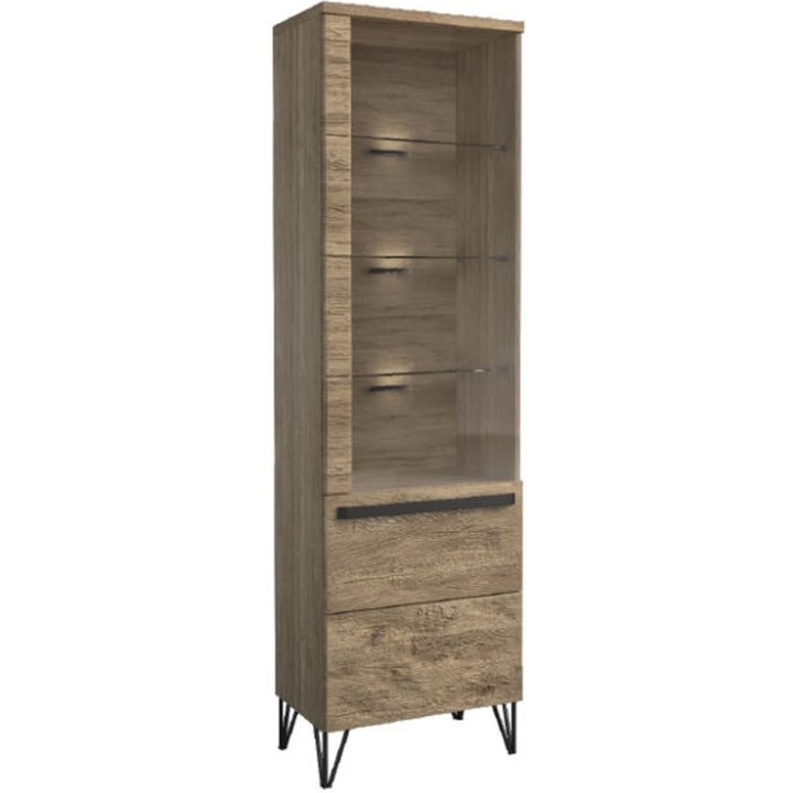 The Pireus display cabinet is a modern piece of furniture with lighting, which will allow for good organisation of the interior and also help to display decorations. The display cabinet has a glass case, thanks to which it can be used to display decorative trinkets. LED lighting, which also emphasises the beauty of the decorations placed on the glass shelves, adds to the charm. The natural combination of wood and black and its simple design will work perfectly in both modern and loft interiors. The fronts are made of solid, rough-hewn wood and the body is made of natural veneer in natural oak lager or chestnut. The high comfort of use is due to the hinges with a soft-close.
