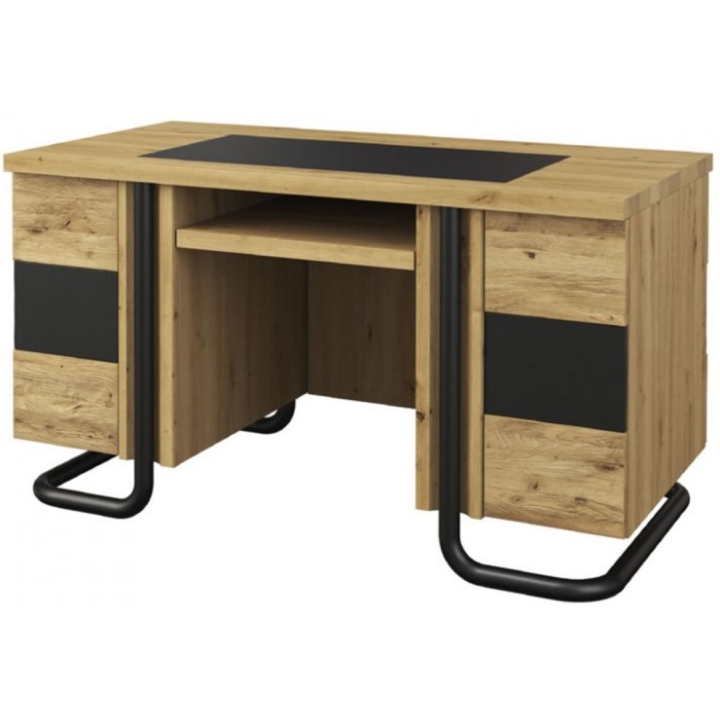 The modern Omega desk from the manufacturer Mebin delights with its solid workmanship and original form. The furniture has a large, spacious top, providing space for work and study. You can put desk or school accessories in two lockable cabinets with shelves. There is also a keyboard shelf. It rests on black metal legs, reminiscent of loft or industrial design. The furniture is characterised by its simple lines, minimalism and functionality. It takes us into an interior where everything is perfectly thought-out. The colour scheme of amber oak with graphite emphasises the unconventional character.