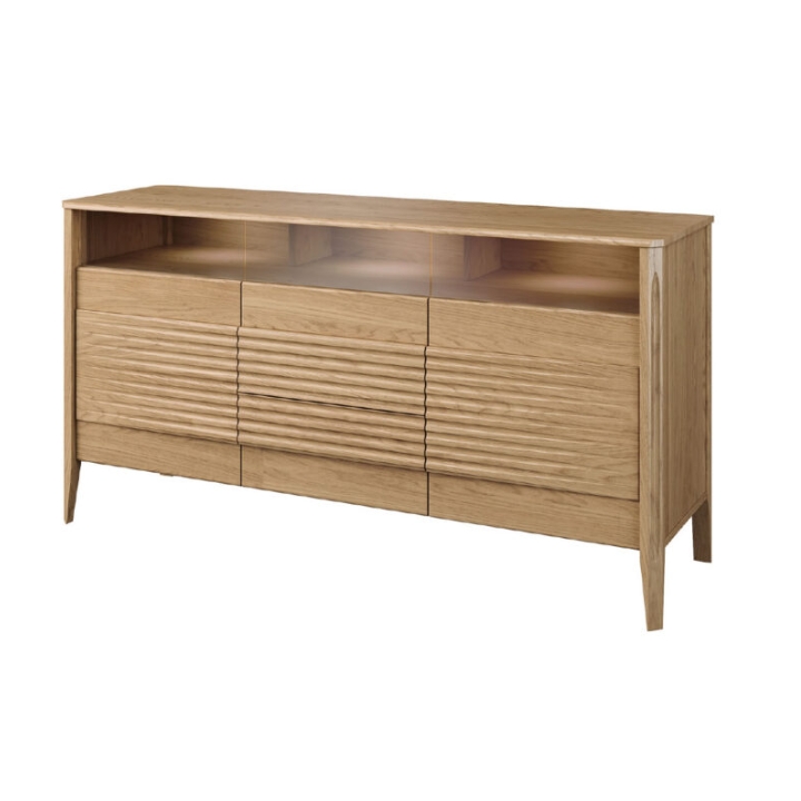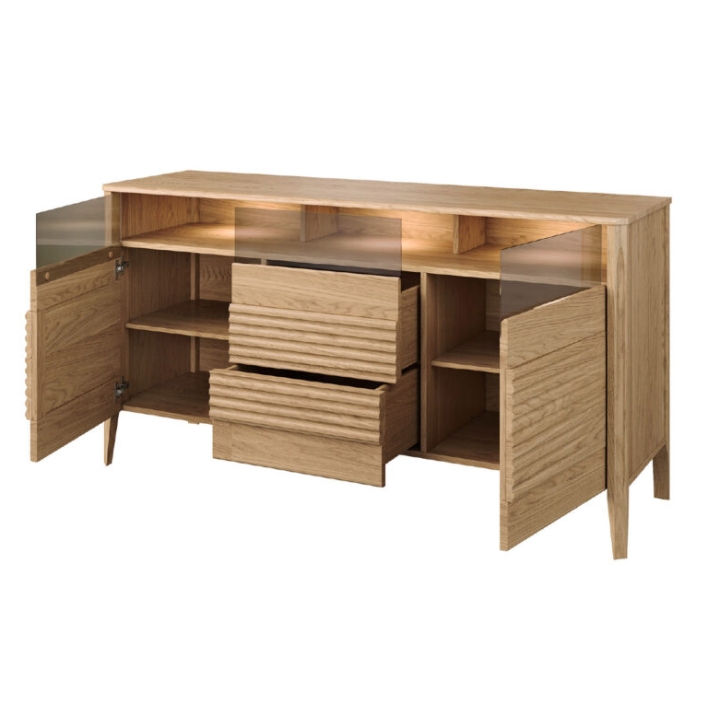 The body of the dresser measures 161 cm wide, 85 cm high and 50 cm deep, which allows it to maintain proportions favorable for a variety of interiors. Its form acquires lightness thanks to high legs, which give the furniture a subtle dynamics. The solid wood construction guarantees stability, while revealing the craftsmanship of the surface.