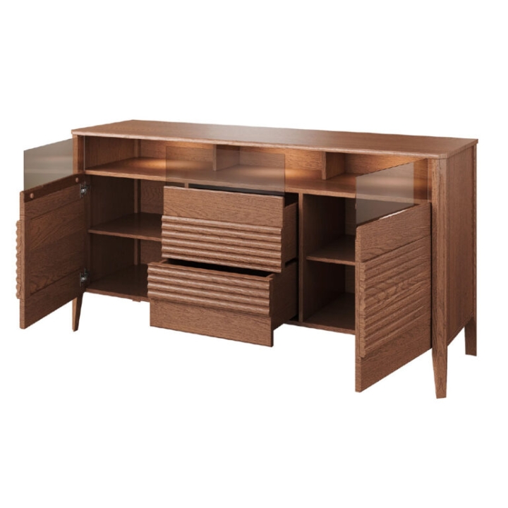 The interior of the piece of furniture was designed with diverse storage options in mind. Behind the solid fronts there are 2 capacious shelves, while another 3 niches for objects are hidden behind the glass part. The central zone is formed by additional 2 drawers placed between the doors, which allows convenient placement of various accessories. The push-to-open mechanism eliminates the need for traditional handles, allowing you to enjoy the perfectly smooth surface of the fronts.
