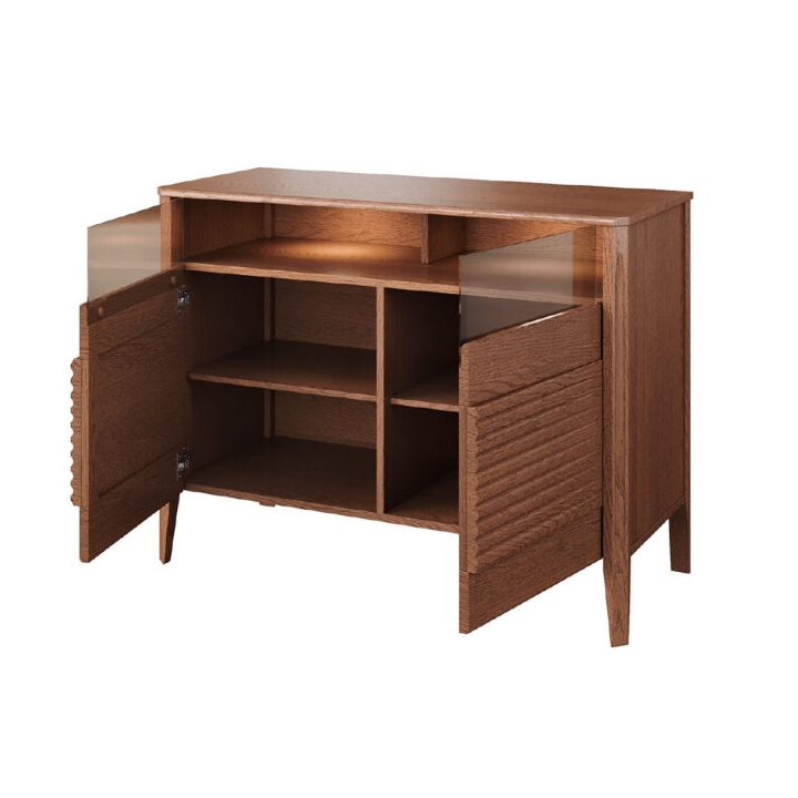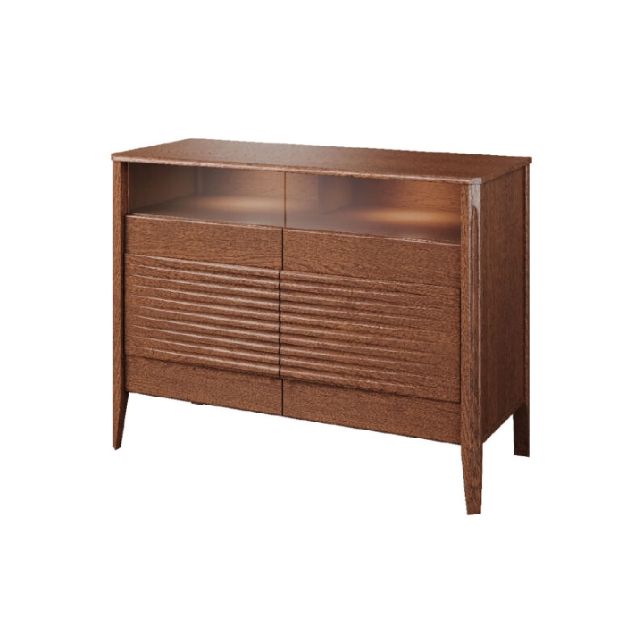 The antisol glass used in the upper parts of the fronts adds a modern touch. Subtle LED backlighting illuminates the shelves behind the glass sheet, creating a soft aura and bringing out the qualities of the stored items. The contrast between the transparent parts and the solid wood construction gives the dresser an expression of artistic balance.