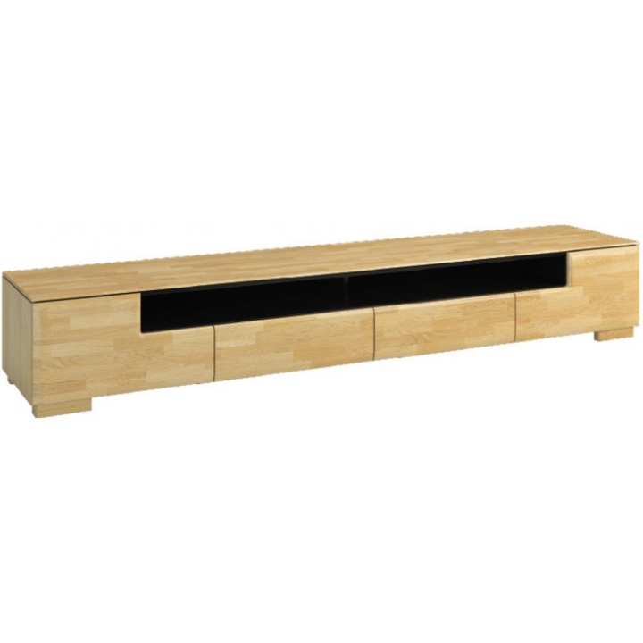 - The fronts of the units are made of solid oak wood, which is combined with dark glass or upholstery fabric (in the bedroom).