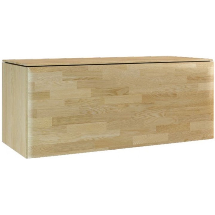 - The fronts of the units are made of solid oak wood, which is combined with dark glass or upholstery fabric (in the bedroom).