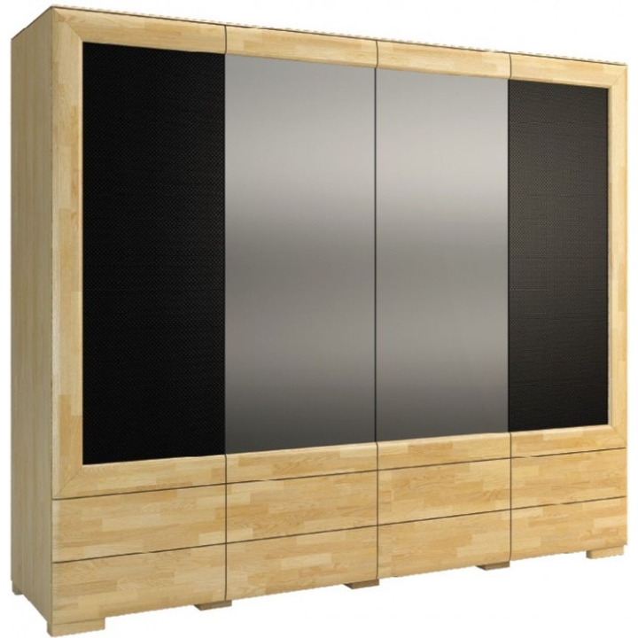 - The fronts of the units are made of solid oak wood, which is combined with dark glass or upholstery fabric (in the bedroom).