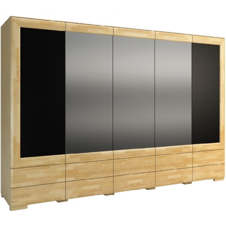 - The fronts of the units are made of solid oak wood, which is combined with dark glass or upholstery fabric (in the bedroom).