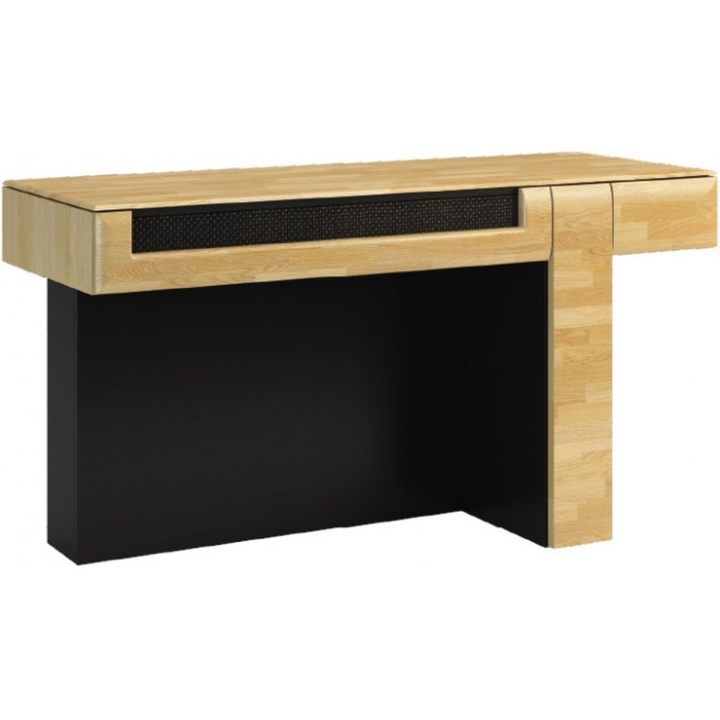 - The fronts of the units are made of solid oak wood, which is combined with dark glass or upholstery fabric (in the bedroom).