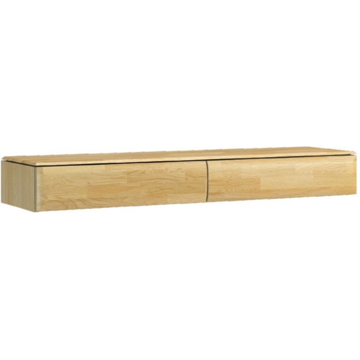 - The fronts of the units are made of solid oak wood, which is combined with dark glass or upholstery fabric (in the bedroom).