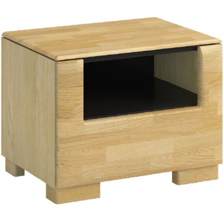 - The fronts of the units are made of solid oak wood, which is combined with dark glass or upholstery fabric (in the bedroom).