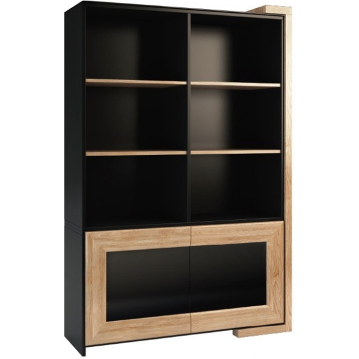 The Corino display cabinet is a unique piece of furniture by Mebin, with which you can organise your books, records and other items. The open display cabinet will also allow you to place decorations. The cabinet body is made of natural veneer, while the lower part of the front is made of solid oak. All lacquered in a pleasant natural oak or very elegant walnut colour. The wreath and the application of black Lacobel glass blend perfectly with this colour scheme. The display cabinet consists of four capacious shelves and two lockable cabinets, equipped with a push-to-open system and a snap closure to guarantee comfortable use of the furniture.