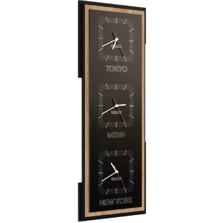 The CORINO triple vertical clock is an elegant and practical addition to modern as well as classic interiors. The three dials are placed on a rectangular sheet of black Lacobel glass. The whole is combined with a profile in natural veneer and set in a black frame. The advantage of the product is that the clock shows the current time on three containers. The piece is fixed to the wall. It looks great in the living room, living room as well as the kitchen. This interesting clock accessory is available in a choice of two colours: natural oak and walnut. There is something for everyone!