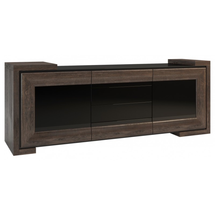 The Corino sideboard by Mebin is a stylish piece of furniture made from high quality solid wood products. It is a functional, but also elegant piece of furniture available in two fashionable colour variants: subtle natural oak and atmospheric walnut. There is something for everyone! The sideboard consists of two lockable doors, concealing capacious shelves and four drawers. The body of the sideboard made of natural veneer is complemented by oak doors. The application and top are made of lacquered black glass, which adds variety and a striking appearance. The capacious interior of the sideboard provides plenty of space to organise and keep the room tidy.