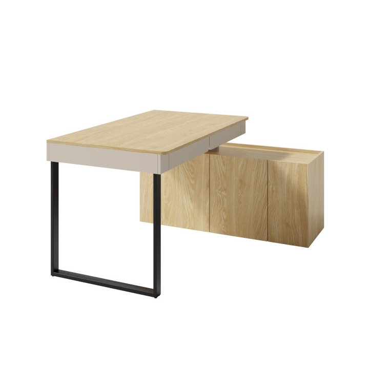 The set includes a sliding section in the form of a chest of drawers with doors, which can be positioned on either side to provide additional storage space for notebooks, office equipment, books or school supplies. The chest of drawers is an integral part of the design and its presence significantly increases the usability of the desk in everyday use, without taking up additional space in the room.
