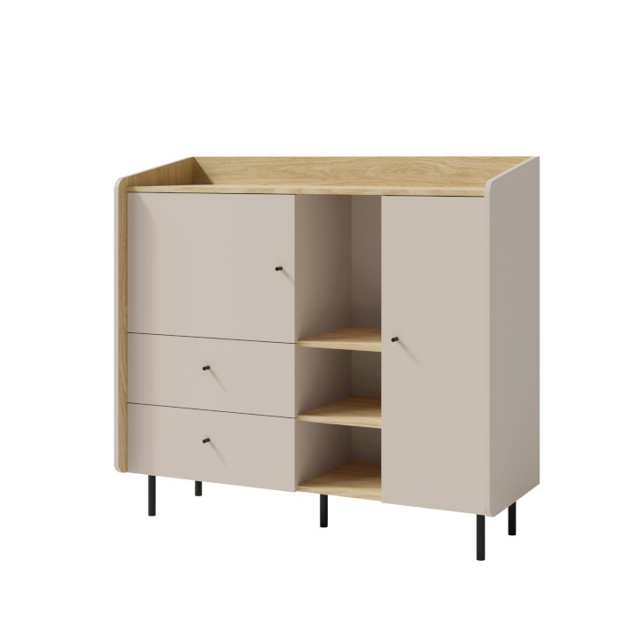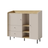 The sand beige fronts contrast with the oiled oak decor body, creating an elegant yet neutral combination that fits in with current design trends. The matt surface reduces light reflections and allows cleanliness to be maintained even with intensive use. The laminated board of which the chest of drawers is made is resistant to abrasion and scratching, and the edges are protected with ABS veneer which increases resistance to mechanical damage.