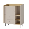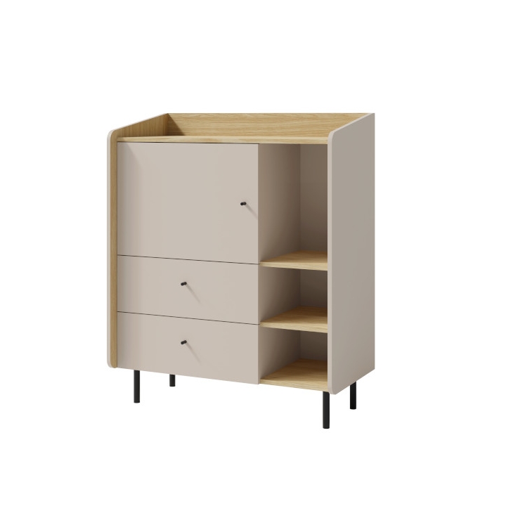 The sand beige fronts juxtaposed with the oiled oak body create a modern and warm combination that easily fits into children's, youth or minimalist home interiors. The matt finish does not reflect light and masks well the minor marks of daily use. The chest of drawers is made of durable, scratch-resistant laminated board and its edges are protected with ABS veneer to protect against dings and moisture.