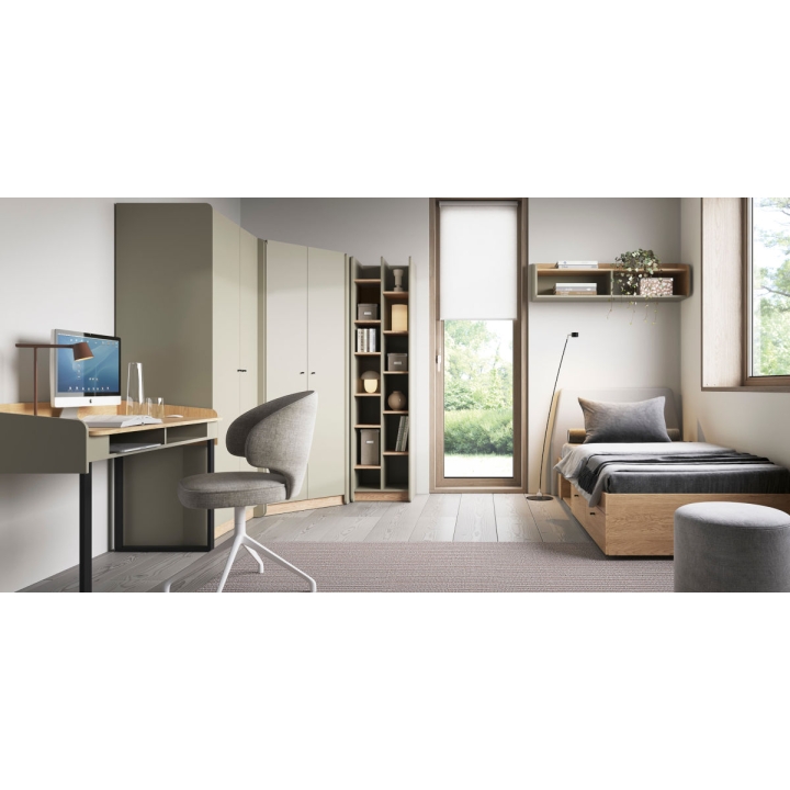 The AE2 corner wardrobe from the Alessio collection by Meblar has been designed to make maximum use of space in the corners of rooms. Its compact but capacious design, measuring 95x195x95 cm, allows for the effective use of spaces that are often left unused in a standard layout. It is the ideal solution for children's and teenagers' rooms, where every centimetre counts.