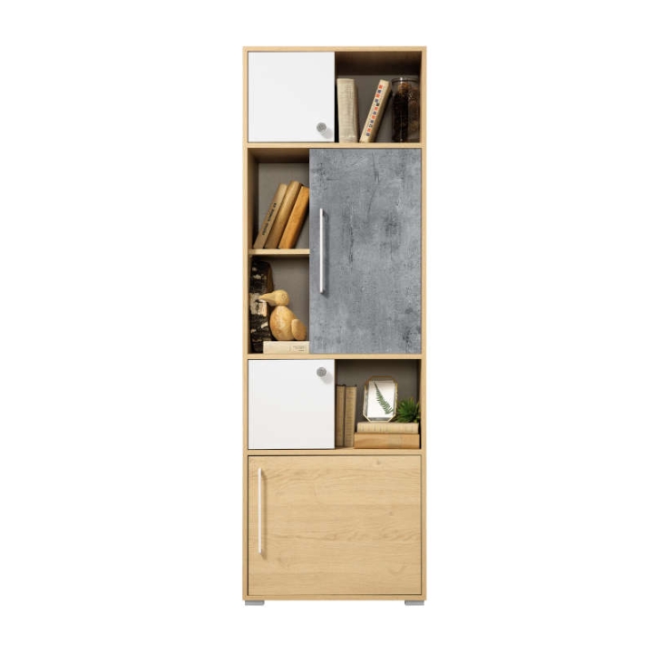 The Step ST4 Bookcase by Meblar blends three distinct finishes - warm oak, crisp white, and raw concrete - to create a piece that feels both modern and inviting. The oak-toned frame emphasizes the natural look of the piece and provides a balanced background for the lighter fronts. With dimensions of 182 cm in height, 60 cm in width, and 40 cm in depth, the bookcase fits easily even in smaller spaces while offering generous storage capacity.