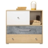 At the top, there is a practical drawer ideal for small items, documents, or accessories you want to keep within reach. Next to it, an open shelf provides space to display decorations, photo frames, or small plants. Below are two wide drawers offering generous storage for clothes, textiles, or other household items that need to stay neatly organized.