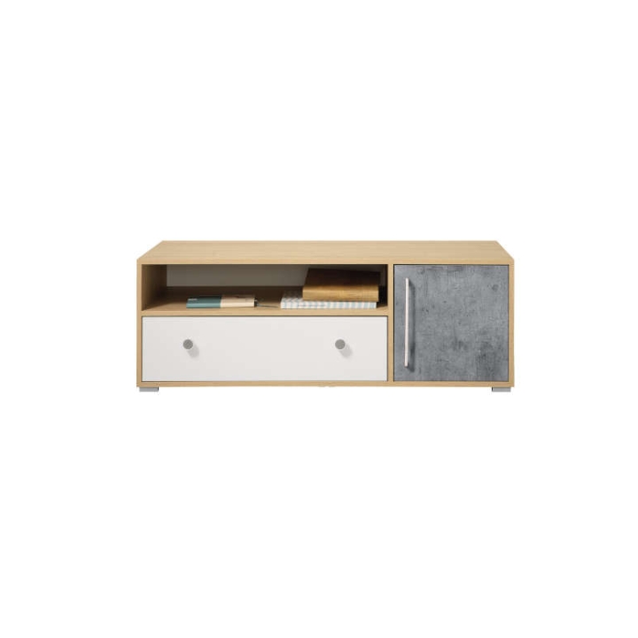 The Step ST8 TV Cabinet by Meblar exudes the charm of natural wood paired with modern color contrasts. The body, made from furniture board in a warm oak finish, brings a cozy, inviting feel to the interior, while the white drawer front and the concrete-colored door give the piece a bold, contemporary look.