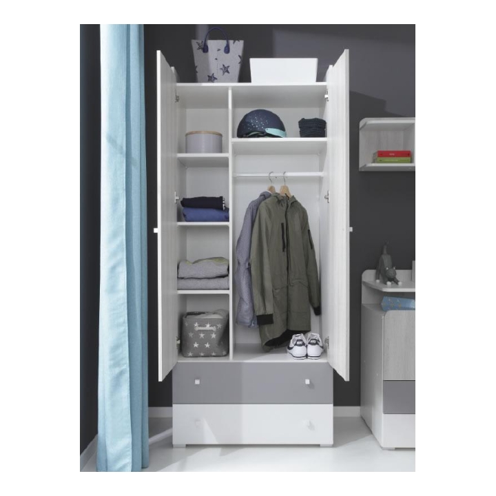 The body and fronts made of durable furniture board ensure long-lasting use and easy maintenance — simply wipe the surface with a soft cloth to keep it looking fresh for years. The white and gray color palette adds a sense of lightness and modern character to any setting. Its clean geometry allows the wardrobe to blend seamlessly into Scandinavian, minimalist, or classic interiors.