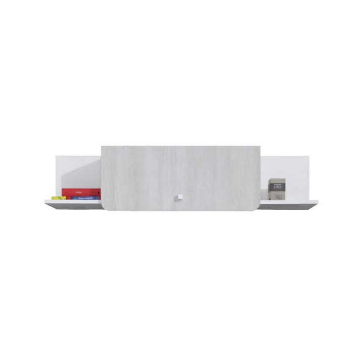 The white body gives the structure a sense of lightness, while the light oak front adds warmth and a touch of natural charm. The central section features a closed cabinet with a door that opens smoothly to the side, providing storage for small items, notebooks, or documents. On both sides, there are open shelves, ideal for displaying books, plants, framed photos, or decorative pieces.