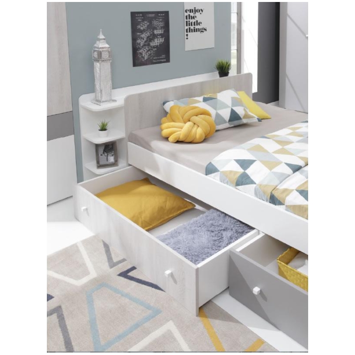On the left-hand side, the bed includes two capacious drawers – one in white and the other in a shade of grey – introducing a refined visual contrast. These drawers serve perfectly for storing bedding, blankets, or seasonal clothing, keeping the room tidy and well-ordered. Thanks to this thoughtful layout, the bed appears as a compact and well-balanced piece that integrates seamlessly into youthful interiors.