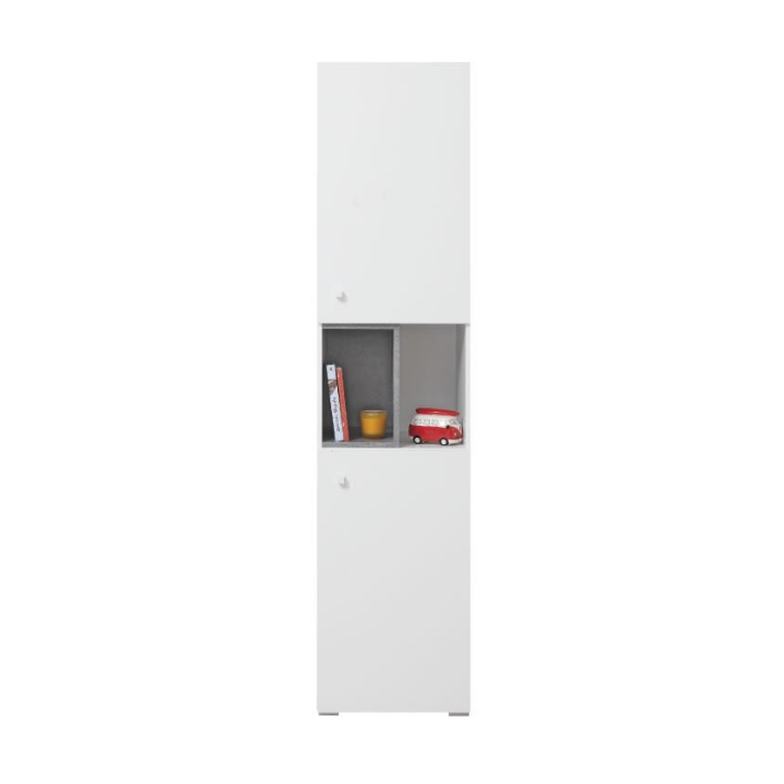 The white fronts brighten the interior and visually enlarge the space, while the concrete-effect insert adds a contemporary, slightly industrial accent. The body made of durable furniture board ensures stability and resistance to daily use, making this model a reliable choice for long-term use. The refined craftsmanship and solid materials highlight its lasting quality.