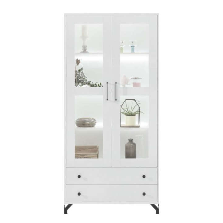 The Bergen BE2 display cabinet by Meblar embodies modern design, where white fronts and body are contrasted with black handles and slender legs. Made from a durable furniture board, it ensures lasting stability and reliability. With dimensions of 190 cm in height, 90 cm in width, and 40 cm in depth, this piece perfectly complements a teen room, offering both a visual focal point and a refined decorative accent.