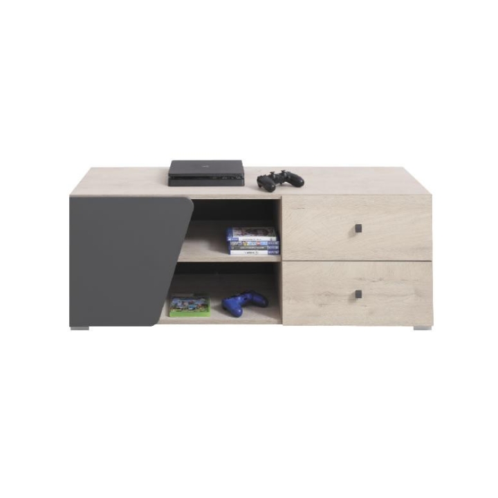 The compact form, measuring 45 cm in height, 120 cm in width, and 50 cm in depth, fits perfectly into a relaxation area, providing an ideal surface for a TV and multimedia equipment. On one side, there are two spacious drawers with oak fronts, perfect for storing remote controls, accessories, or small electronic devices. On the opposite side, a shelf partially covered with an anthracite front panel discreetly accommodates consoles or players, allowing easy access to connected cables.