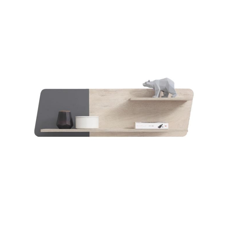 The Delta DL13 wall shelf by Meblar is a unique decorative element that combines the warm tone of oak with a cool anthracite background, adding modern character and visual depth to any interior. With a height of 33cm, a width of 110cm, and a depth of 25cm, it provides a compact yet impressive display space for books, plants, photo frames, or collectible items.