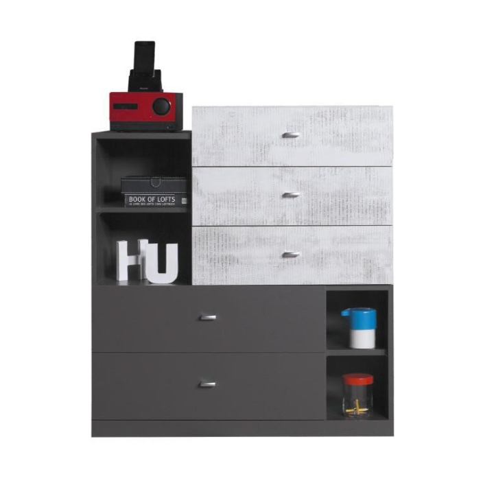 The top section includes three drawers with light grey printed fronts, ideal for storing documents or small accessories. Next to them, there’s an open graphite-colored shelf—a perfect spot for displaying books, plants, or decorations. Below, you’ll find two spacious drawers in a dark graphite shade, which add character and a modern, energetic touch to the design. Beside the lower drawers, there’s an additional open compartment with a shelf, great for small décor or everyday items.